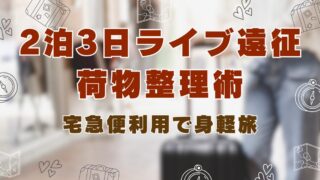 推し活 2泊3日ライブ遠征の持ち物と荷物整理術|宅急便で身軽に動けた私の準備記録 2泊3日のライブ遠征で実際に使った持ち物と荷物整理術を紹介。宅急便を活用して身軽に動けた準備のコツをまとめました。服やメイク用品のパッキング、便利グッズ選びなど体験ベースで解説。荷物が多くなりがちな推し活旅を、コンパクトに快適に楽しみたい人へ。 2025.10.11 推し活