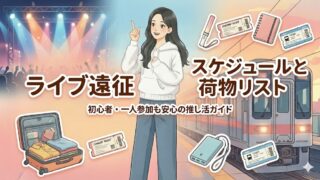初めての1泊2日ライブ遠征でも安心して推し活を楽しめるよう、ホテル選びや交通手段、持ち物の準備、当日のスケジュール、翌日の過ごし方、そして現地での過ごし方のポイントまで、大人女子のリアルな遠征経験をもとに丁寧に解説しています。